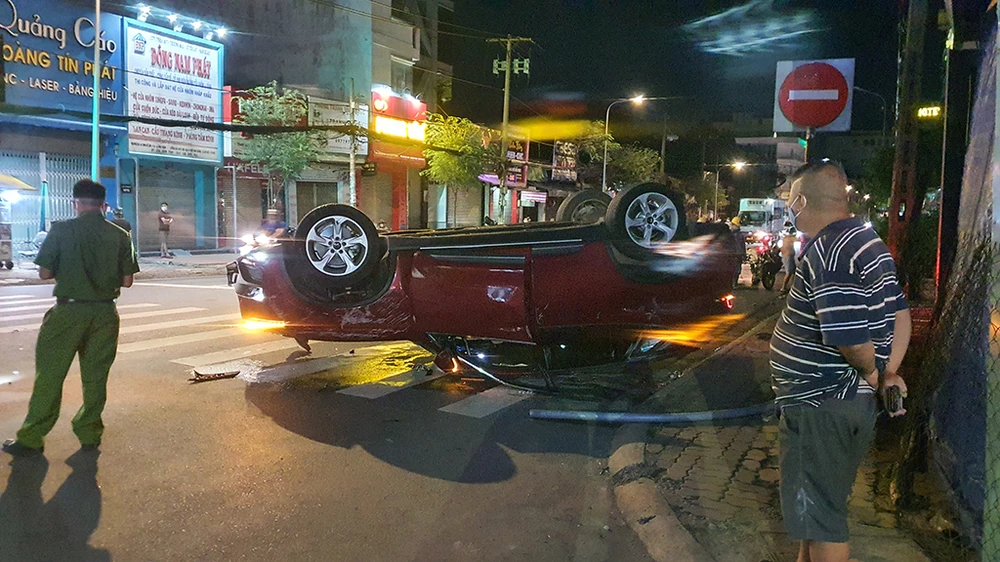 Tại hiện trường, ô tô lật ngửa, phần đầu xe hư hỏng, bể nát. Trụ đèn bị tông ngã nằm trên vỉa hè.