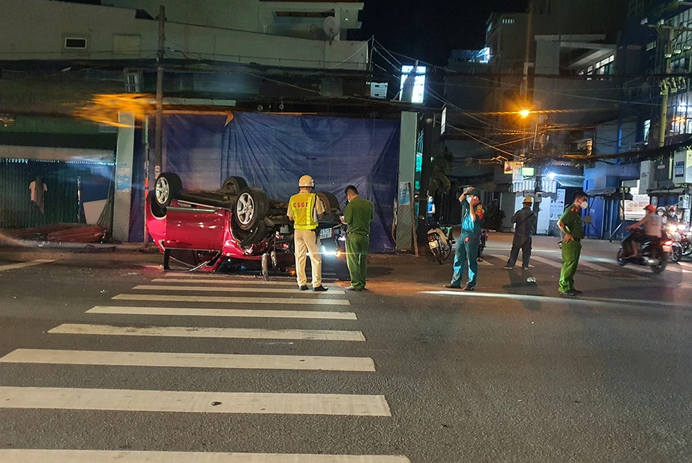 Đến 22 giờ 30, lực lượng chức năng quận Bình Thạnh, TP.HCM, vẫn đang xử lý hiện trường, điều tra nguyên nhân vụ tai nạn khiến một ô tô lật ngửa trên đường Đinh Bộ Lĩnh, phường 26.