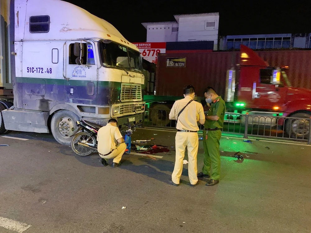 Tại hiện trường, xe máy nạn nhân nằm ngay trước đầu xe container, bể nát phần đầu, gãy bánh.
