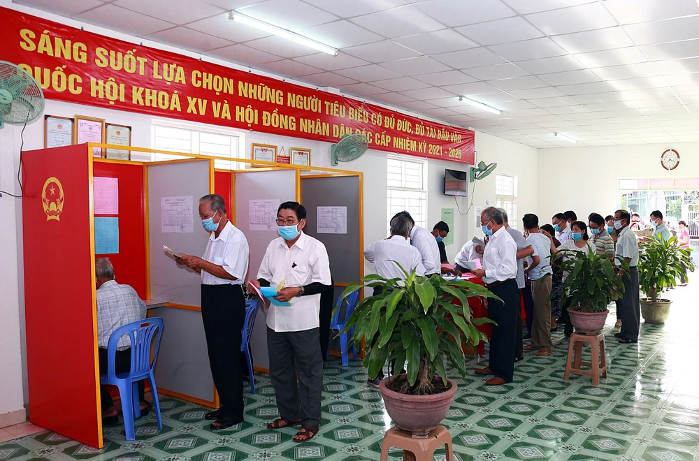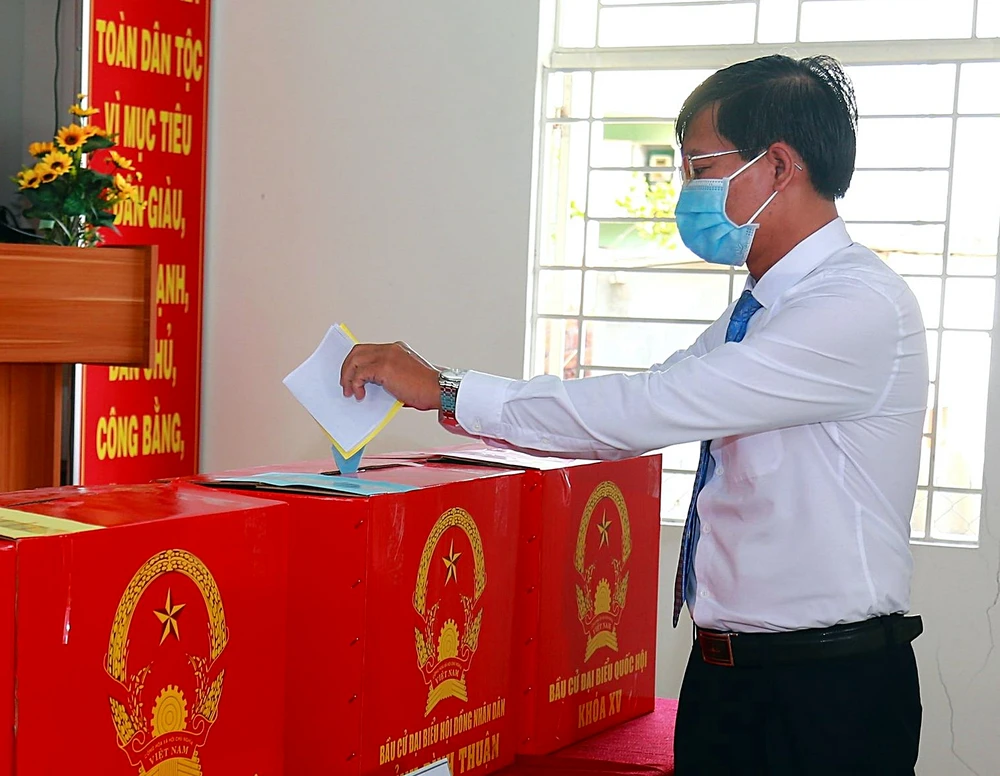 Tại khu vực bỏ phiếu số 1, khu phố 1, phường Phú Trinh, TP Phan Thiết, tỉnh Bình Thuận, trước khi vào điểm bỏ phiếu, các cử tri đã được kiểm tra thân nhiệt, rửa tay sát khuẩn... theo quy trình phòng chống dịch COVID-19 chặt chẽ. Ông Lê Tuấn Phong, Chủ tịch UBND tỉnh là người đến khá sớm bỏ phiếu ở điểm bỏ phiếu này.