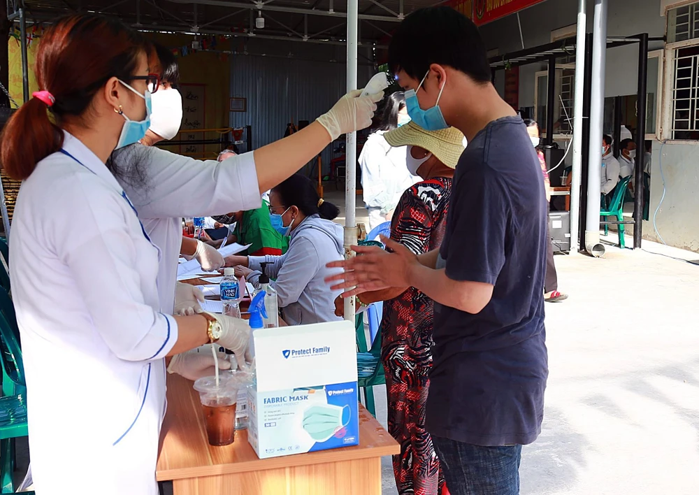 Cử tri được đo thân nhiệt, rửa tay sát khuẩn trước khi vào điểm bỏ phiếu. Ảnh: PN