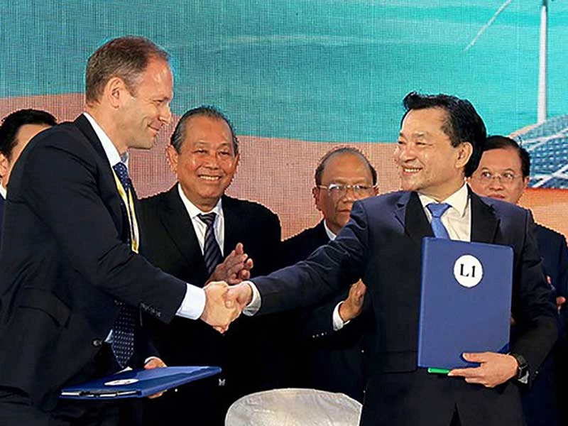 Dưới sự chứng kiến của Phó Thủ tướng Trương Hòa Bình, lãnh đạo tỉnh Bình Thuận trao giấy chứng nhận đầu tư cho cách doanh nghiệp. Ảnh: PN