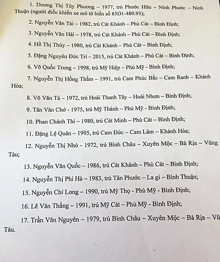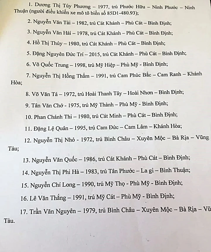 Danh sách 17 người bị thương trong vụ tai nạn.