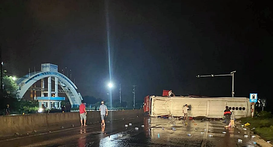 Sau va chạm, xe khách lật chắn ngang làn đường bên trái. Vụ tai nạn đã làm bà Phượng và 16 người trên xe khách bị thương.