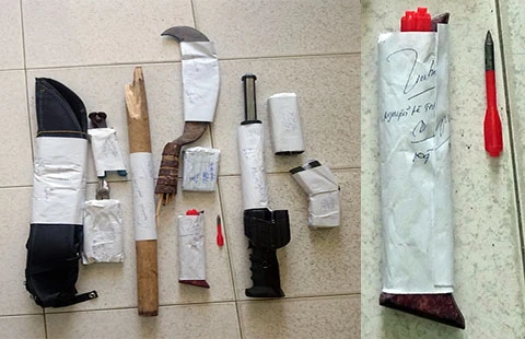 Trước khi rút khỏi hiện trường, nhóm này còn đập phá nhiều tài sản trong nhà ông Nhân. Nhìn đống hung khí nhóm này sử dụng bị cơ quan điều tra khám xét, tịch thu trong đó có nhiều mũi tên sắt, không ai không khỏi rùng mình.