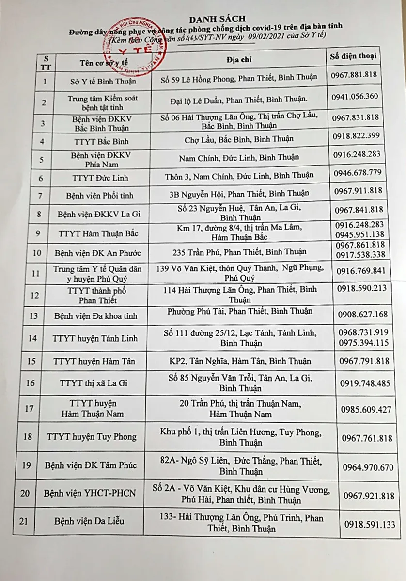 Sở Y tế Bình Thuận đề nghị các địa phương và cơ quan truyền thông, thông báo thông tin cho người dân được biết, liên hệ ngay với Trung tâm Kiểm soát bệnh tật tỉnh và các trung tâm y tế huyện, thị, thành phố (xem ảnh) qua đường dây nóng để được theo dõi sức khỏe, hướng dẫn và cung cấp số điện thoại những người đã tiếp xúc với mình.