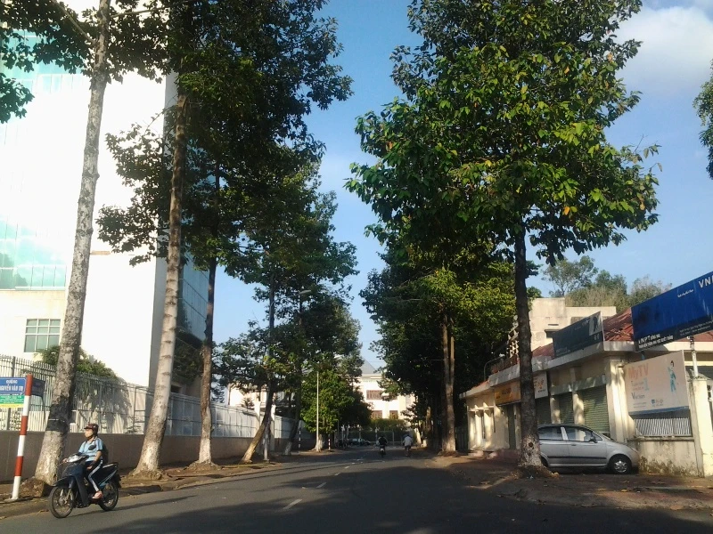 Hai bên đường rợp bóng mát hàng cây dầu cao vun vút.