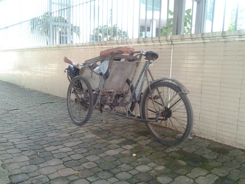 Bác xích lô nằm thảnh thơi đợi khách trên vỉa hè.