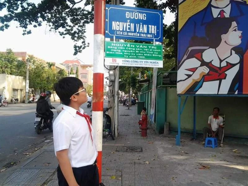 Một học sinh trường tiểu học Nguyễn Du đang đứng đọc bảng tên và tiểu sử của con đường mang tên mới, đường Nguyễn Văn Trị.