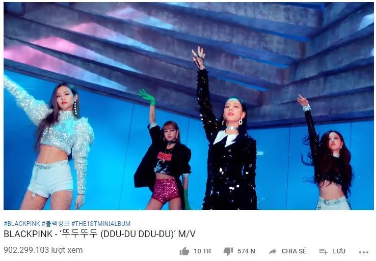MV Ddu du ddu ducủa bốn cô nàng xinh đẹp Black Pink đã bỏ túi hơn 900 triệu lượt xem chỉ sau một năm một tháng 14 ngày kể từ khi phát hành, trở thành nhóm nhạc đầu tiên trong lịch sử Kpop làm được điều này.