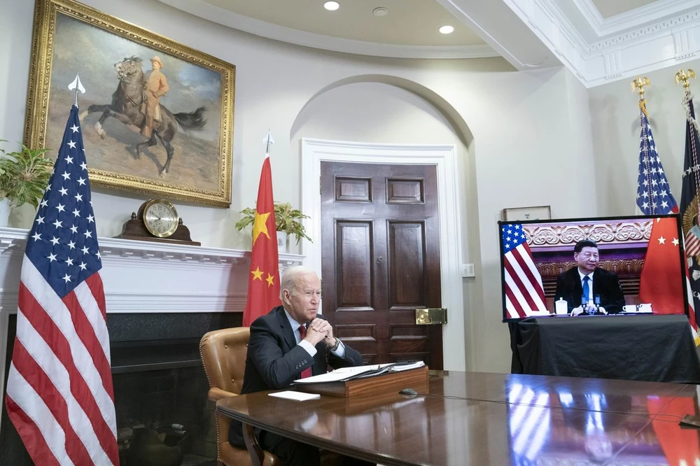 Cuộc họp thượng đỉnh trực tuyến giữa Tổng thống Mỹ Joe Biden và Chủ tịch Trung Quốc Tập Cận Bình. Ảnh: BLOOMBERG