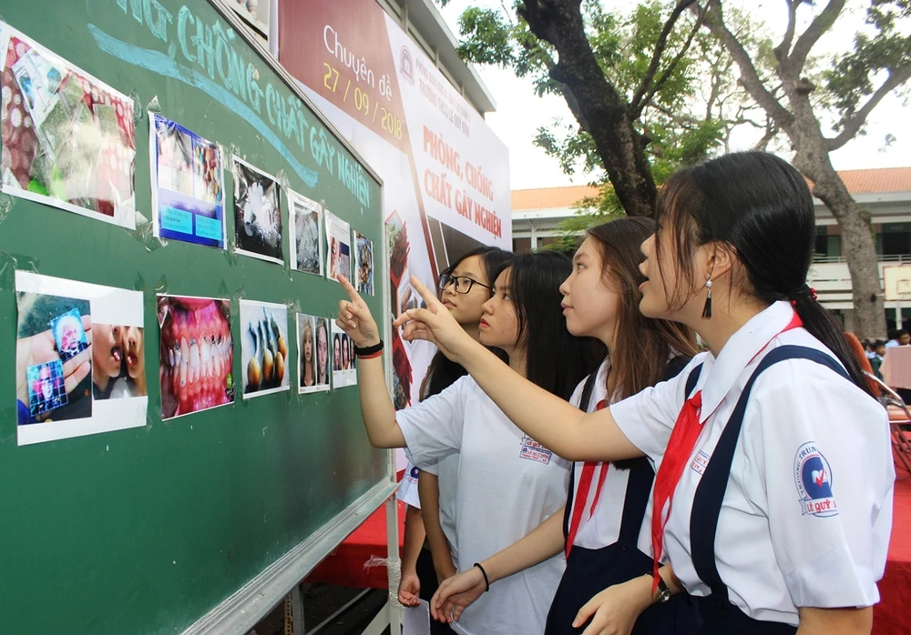 Các em học sinh tìm hiểu về tác hại của các chất gây nghiện. Ảnh: HL