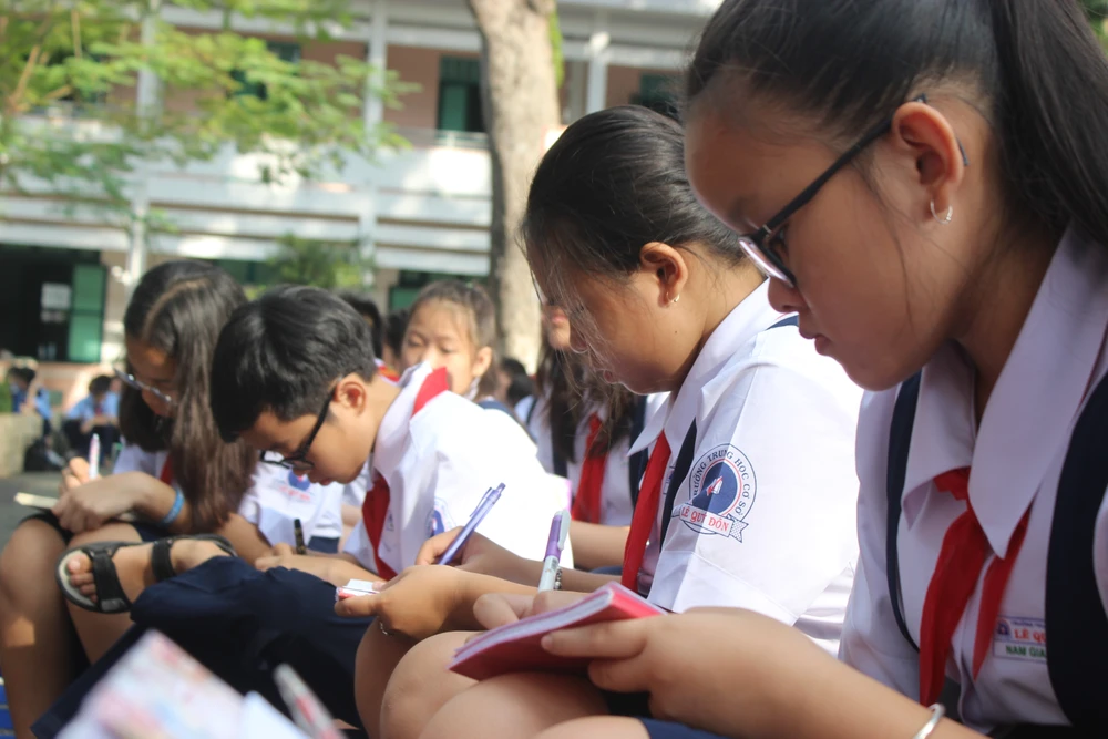 Các em học sinh chăm chú ghi chép kiến thức được chia sẻ. Ảnh: HL