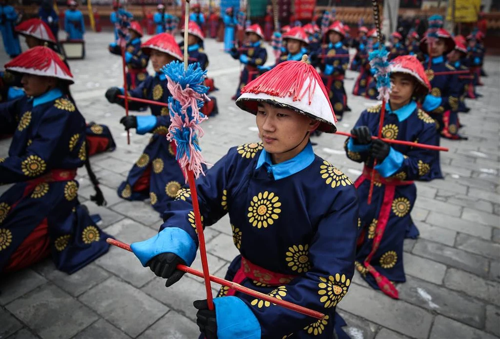 Trình diễn tái hiện thời nhà Thanh (1636-1912) ở Bắc Kinh (Trung Quốc) ngày mùng Một, nhằm ngày 28-1. Ảnh: EPA