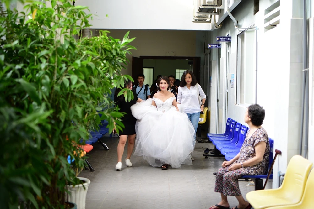 Mọi người trong bệnh viện ngắm nhìn đôi bạn trẻ chụp ảnh cưới.
