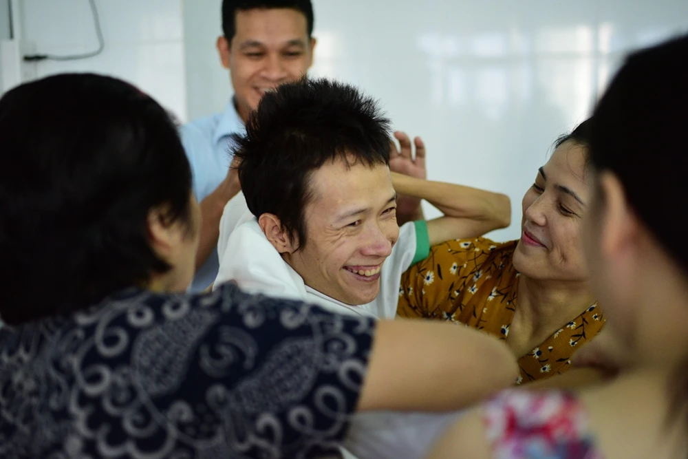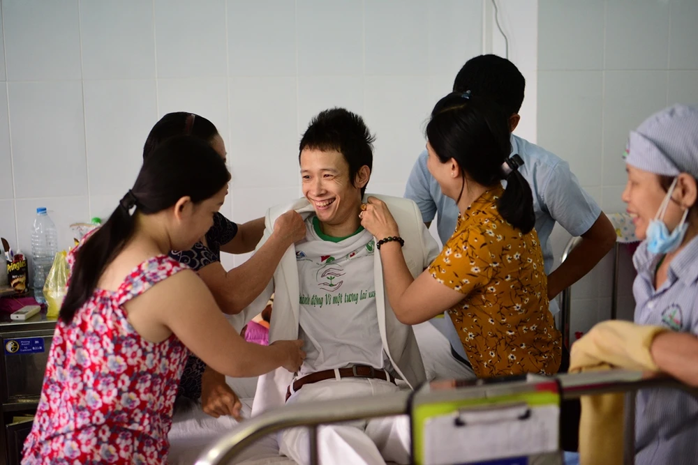 Hộ lý, điều dưỡng, chị lao công, bệnh nhân điều trị tại Viện cũng đến chia vui với anh Thành - chị Nga.