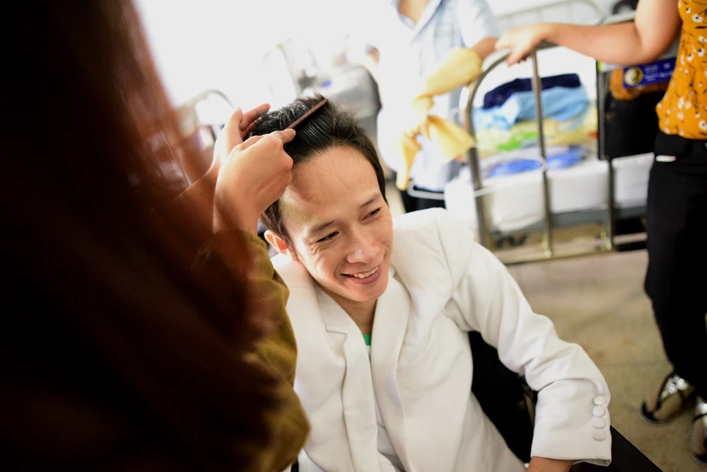 Nhiều người ở bệnh viện đến phụ giúp anh Thành. Người thì thay đồ, người thì lo phụ giúp cô dâu, chú rể.