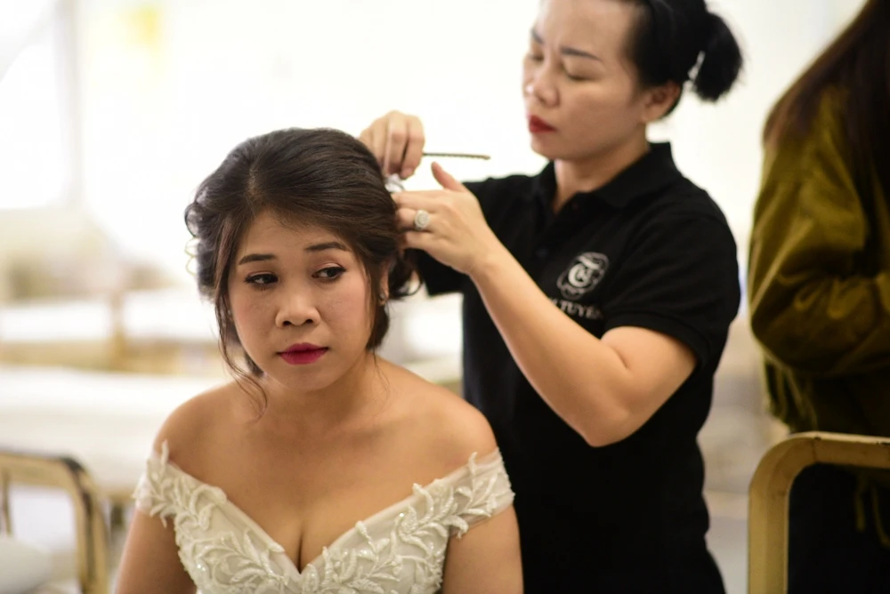 Chị Nga được trang điểm.