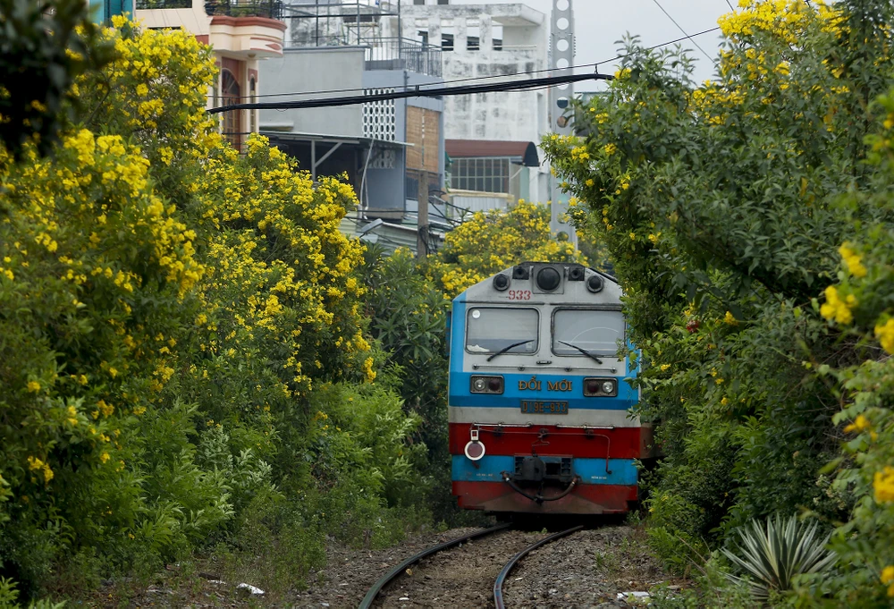 Dọc hai bên đường ray, hoa huỳnh liên tạo nên bóng mát. Tiếng còi tàu và sắc hoa huỳnh liên là hai thứ gắn liền với người dân quanh đây.