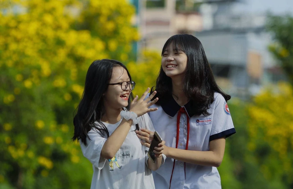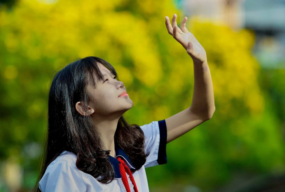 Em rất thích được chụp ảnh với huỳnh liên vì màu vàng của loại hoa này rất nổi bật, Vy Vy (lớp 7, trường Đoàn Thị Điểm, quận 3) chia sẻ.