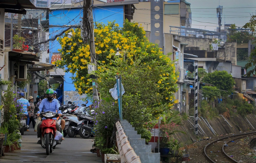 Đặc biệt, dọc đường ray nối liền các quận 3, Phú Nhuận, huỳnh liên đang vào mùa bung nở, nhiều bạn trẻ thường đến đây vào cuối tuần để chụp ảnh, check-in.