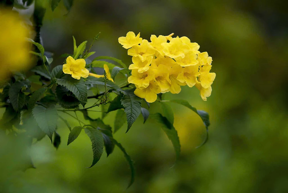 Hoa huỳnh liên có tên gọi khác hoàng yến, hoa chuông vàng hoa có màu vàng óng, hình chuông, thường trổ thành từng cụm.