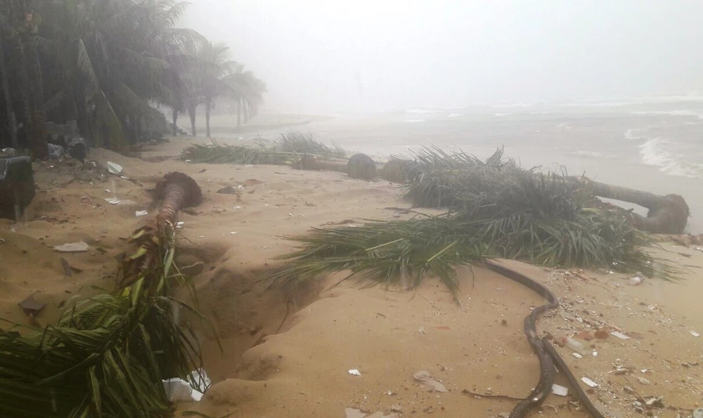 Hàng chục cây dừa nằm sâu trong bờ biển cũng bị sóng lớn đánh trốc gốc, trôi ra biển. Nhà hàng, quán bar nằm cạnh cống xả Mỹ An hiện đang bị sạt lở nặng phần móng. Nhiều đồ đạc, bàn ghế, phần mái cùng hệ thống bậc tam cấp cũng bị cuốn trôi. Người dân phải di dời các vật dụng còn lại có khả năng bị sạt lở và cuốn trôi.