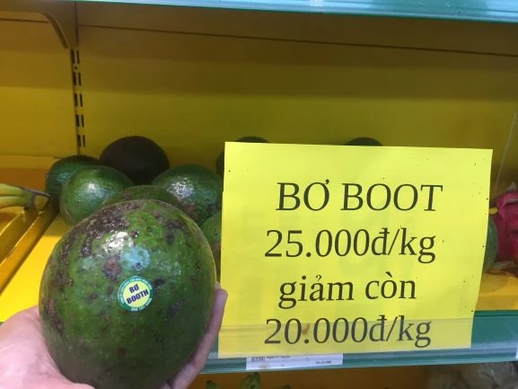 Ghi nhận tại một số chợ lẻ như Tân Sơn Nhất, bà Hoa bơ booth tùy trọng lượng giá bán 30.000-50.000 đồng/kg. Trong khi đó, cửa hàng Bách Hóa Xanh bơ booth đang giảm 5.000 đồng còn 20.000 đồng/kg.