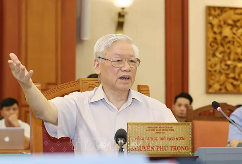 Tổng Bí thư, Chủ tịch nước Nguyễn Phú Trọng, Bí thư Quân ủy Trung ương tại buổi làm việc với Ban Thường vụ Quân ủy Trung ương sáng 12-9. Ảnh: TTXVN
