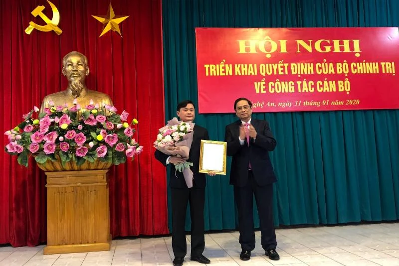 Ông Phạm Minh Chính, Trưởng Ban Tổ chức Trung ương, trao quyết định và tặng hoa chúc mừng ông Thái Thanh Quý giữ chức bí thư Tỉnh ủy Nghệ An.