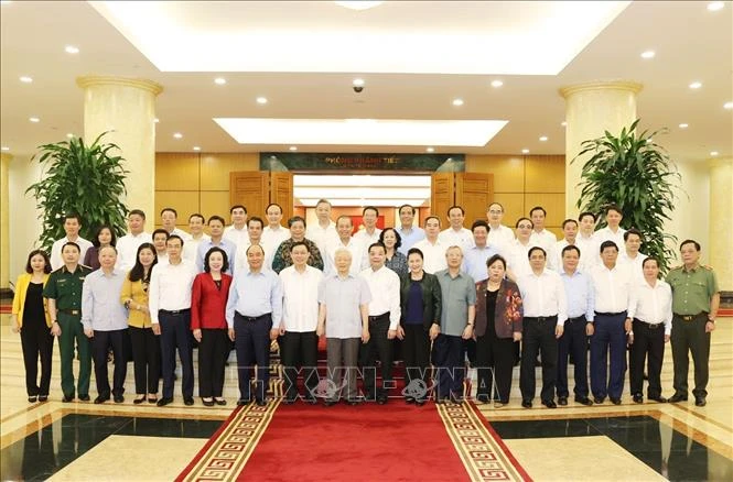 Tổng Bí thư, Chủ tịch nước Nguyễn Phú Trọng và các lãnh đạo dự buổi làm việc với Ban Thường vụ Thành ủy Hà Nội. Ảnh: TTXVN