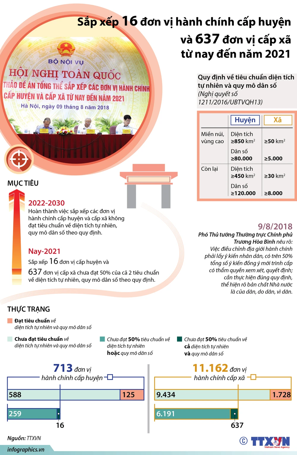 Ngoài ra, 9.434/11.162 đơn vị hành chính cấp xã (chiếm 84,51%) chưa đạt tiêu chuẩn về diện tích, dân số. Trong đó 6.191 đơn vị chưa đạt 50% của 1 trong 2 tiêu chuẩn diện tích hoặc dân số; có 637 đơn vị đồng thời chưa đạt 50% của cả 2 tiêu chuẩn diện tích và dân số.
