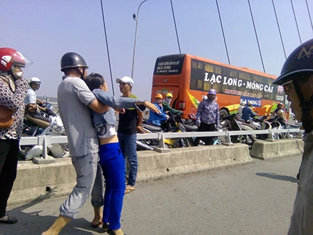 Nhận được tin nhắn, gia đình chồng chị Tr. đã cử ông Đ. đón con ở khu vực cầu Bính vào sáng sớm ngày 13/7 để ngăn chặn việc chị Tr. tự tử. Tuy nhiên, ông Đ. không ngăn kịp chị Tr. nhảy cầu.