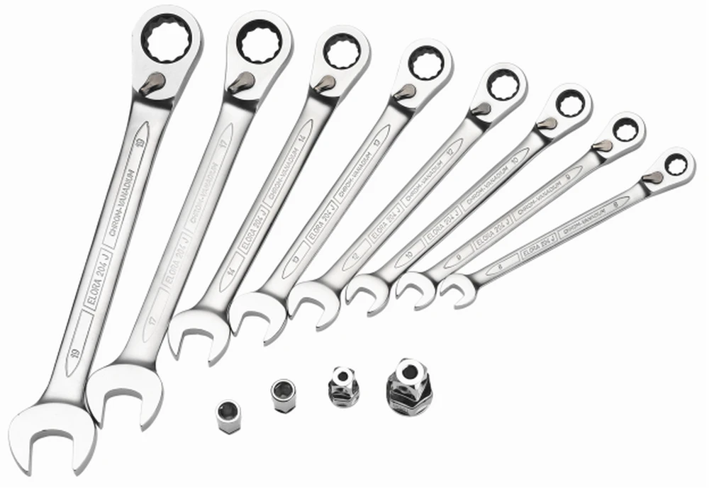 Vật liệu nói chung tất cả đều bằng hợp kim Chrome Vanadium. Elora sản xuất chủ yếu là loại có bề mặt xi mờ hay đơn giản là nhám, chống trơn. Cơ cấu bánh cóc 72 răng cho góc xoay hiệu dụng chỉ 5 độ. Cờ lê tự động hay cờ lê lắc tay cũng chỉ là cách gọi khác nhau. Một trong những cách hay nhất là bạn chọn theo các bộ cờ lê tiêu chuẩn. Tức là nhà sản xuất đã lọc sẵn các bộ với những thành phần khác nhau. Bộ nào gần với yêu cầu của bạn nhất thì lấy. Có thể trong bộ thiếu đi một vài size, thông thường là thừa 1-2 kích cỡ bạn ít dùng. Nó vẫn là lựa chọn tối ưu nhất và tiết kiệm thời gian nhất cho bạn.