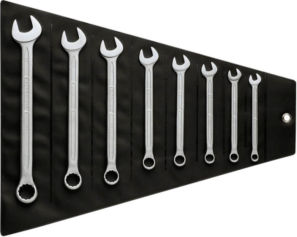 Bộ cờ lê được đựng trong túi vải dạng cuộn lại. Ngăn cách các cờ lê bằng đường chỉ may, vát xéo từ nhỏ tới lớn. Túi vải màu đen, có đai cuộn cài chặt, có lỗ treo lên kệ hoặc bảng treo đính tường. Trên mỗi khe cài cờ lên đều có đánh số kích thước của cờ lê vòng miệng tương ứng. Thuận tiện cho chọn lựa khi sử dụng.