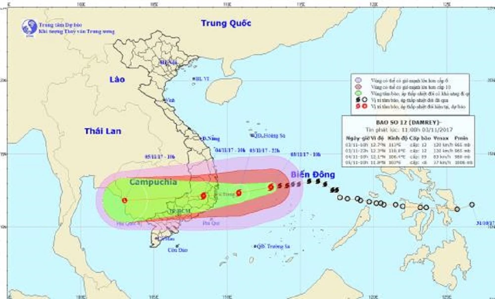 | Hồi 10 giờ ngày 3-11, vị trí tâm bão ở vào khoảng 12,7 độ Vĩ Bắc; 113,0 độ Kinh Đông, cách bờ biển Khánh Hòa-Ninh Thuận khoảng 400 km về phía Đông. Sức gió mạnh nhất ở vùng gần tâm bão mạnh cấp 12 (115-135 km/giờ), giật cấp 15. Dự báo trong 12 giờ tới, bão di chuyển theo hướng Tây Tây Nam, mỗi giờ đi được khoảng 20 km. Đến 22 giờ ngày 3-11, vị trí tâm bão ở vào khoảng 12,3 độ Vĩ Bắc; 110,8 độ Kinh Đông, cách bờ biển Khánh Hòa-Ninh Thuận khoảng 170 km về phía Đông. Sức gió mạnh nhất ở vùng gần tâm bão mạnh cấp 12 (115-135 km/giờ), giật cấp 15. Dự báo trong 12 đến 24 giờ tiếp theo, bão di chuyển theo hướng Tây, mỗi giờ đi được 20 km, khoảng sáng sớm mai (4-11) bão sẽ đi vào đất liền các tỉnh từ Nam Phú Yên đến Bắc Bình Thuận với sức gió mạnh nhất cấp 11, giật cấp 14, sau đó suy yếu dần. Đến 10 giờ ngày 4-11, vị trí tâm bão ở vào khoảng 12,1 độ Vĩ Bắc; 108,4 độ Kinh Đông, trên đất liền ven biển các tỉnh Nam Phú Yên-Bắc Bình Thuận. Sức gió mạnh nhất ở vùng gần tâm bão mạnh cấp 8-9 (60-90 km/giờ), giật cấp 12. Do ảnh hưởng của bão, vùng biển phía Tây khu vực giữa biển Đông (bao gồm cả vùng biển phía Tây Bắc quần đảo Trường Sa) có mưa bão, gió mạnh cấp 8-10, vùng gần tâm bão đi qua mạnh cấp 11-12, giật cấp 15; biển động dữ dội. |