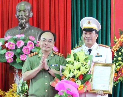 Ông Lê Quốc Hùng (phải) khi nhận quyết định bổ nhiệm giám đốc Công an tỉnh Thừa Thiên-Huế vào tháng 8-2015. Ảnh: BLN