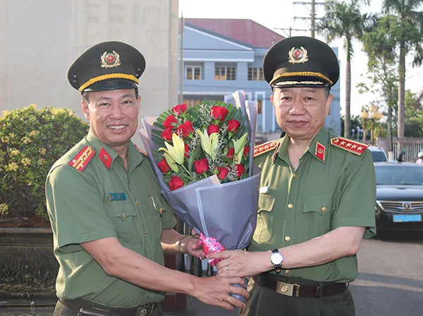 Giám đốc Công an tỉnh Bạc Liêu Lê Tấn Tới (trái) tặng hoa Bộ trưởng Tô Lâm khi đoàn công tác Bộ Công an về làm việc với tỉnh nhà vào tháng 3-2019. Ảnh: CAND