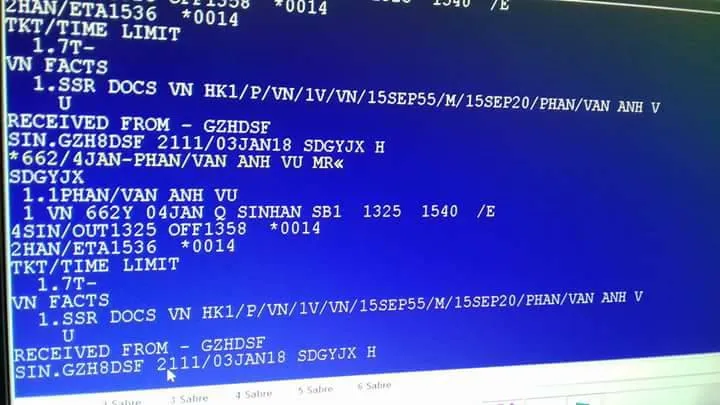 Thông tin về vé bay của hành khách Phan Văn Anh Vũ trên màn hình máy tính tại sân bay Changi, Singapore chiều 4-1.