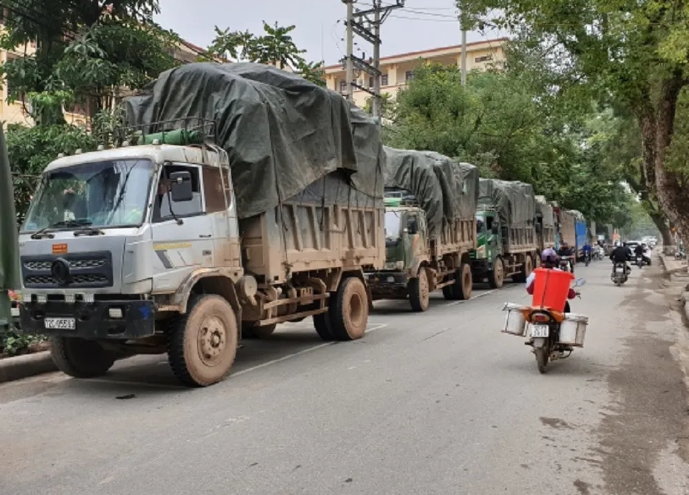 Hàng chục xe tải chở theo hàng hóa bị công an thu giữ.