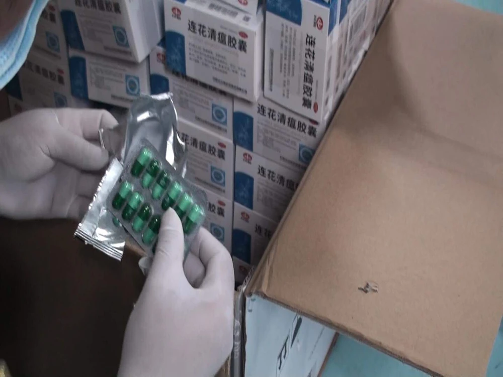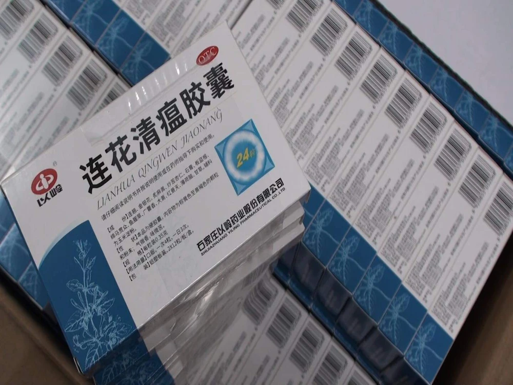 Thuốc mang nhãn hiệu Trung Quốc, được gọi là “Liên Hoa Thanh Ôn” và quảng cáo là có tác dụng điều trị COVID-19. Ảnh: CA