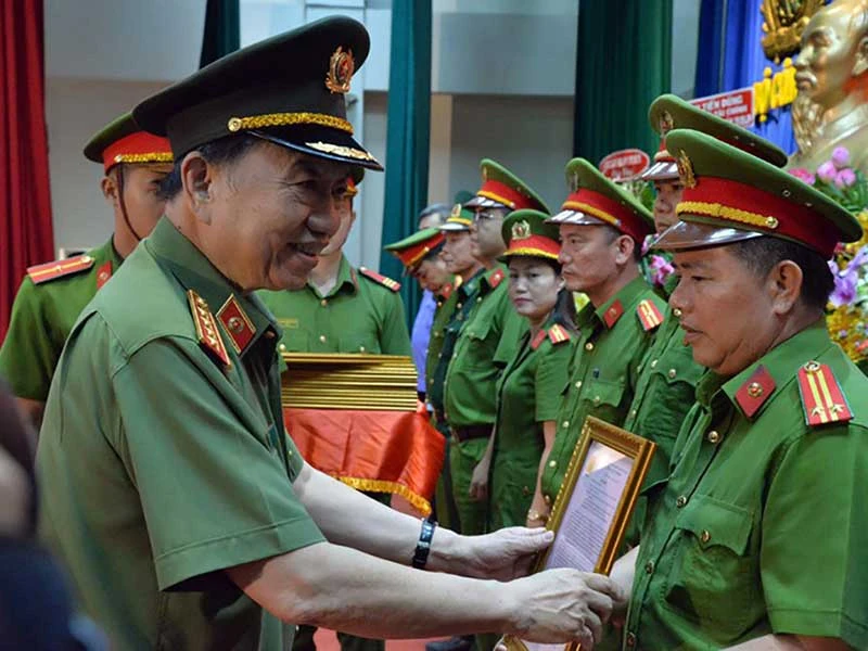 Bộ trưởng Bộ Công an Tô Lâm trao bằng khen cho các đơn vị có thành tích xuất sắc trong phòng, chống tội phạm về ma túy. Ảnh: CA