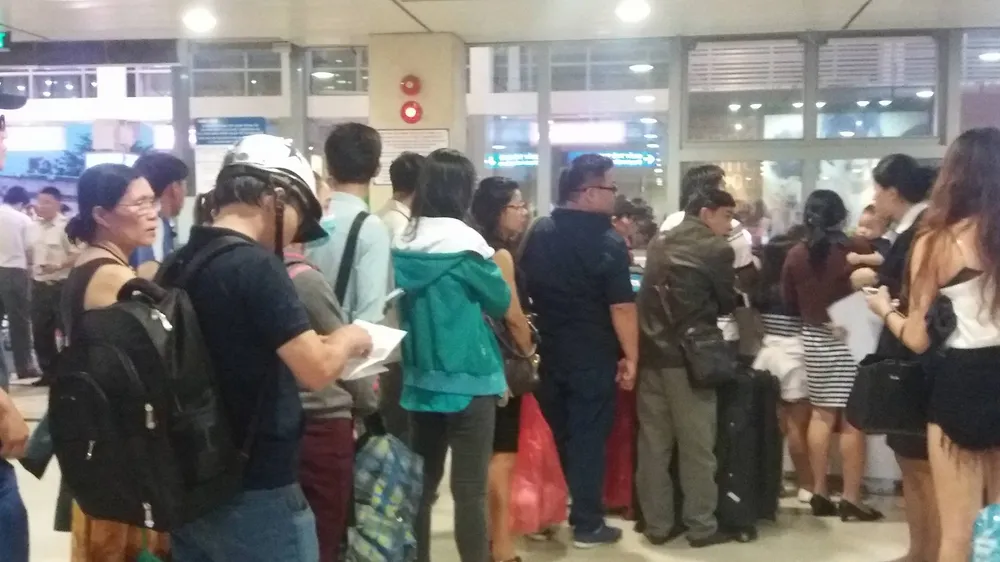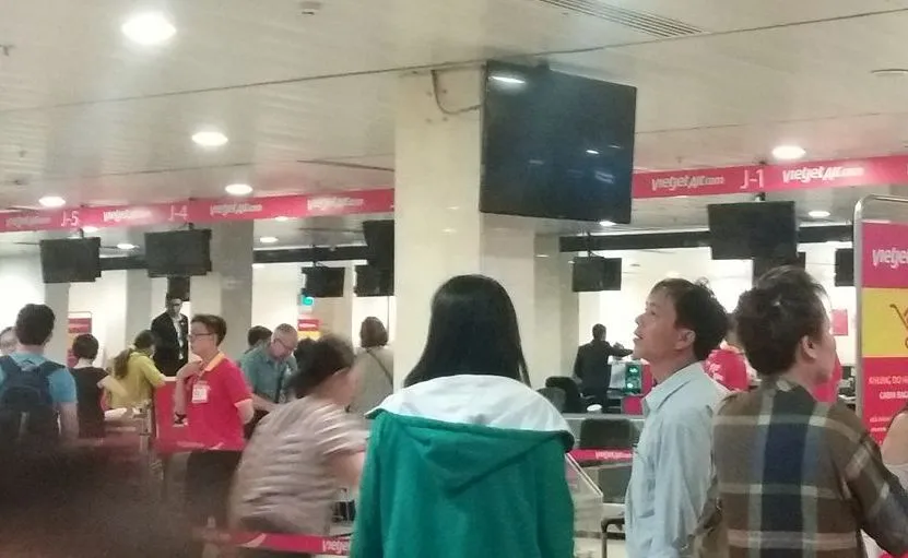 Tại sân bay Tân Sơn Nhất, khu vực làm thủ tục của Hãng hàng không VietJet hiện rất nhốn nháo. Anh Thanh ở Bình Chánh về Buôn Ma Thuột cho biết: "Hôm nay tôi phải xếp hàng đợi khá lâu. Lúc tới đây tôi được nhân viên thông báo hệ thống bị lỗi nên phải đợi lâu. Tôi được hướng dẫn qua quầy khác cùng mọi người xếp hàng làm thủ tục".