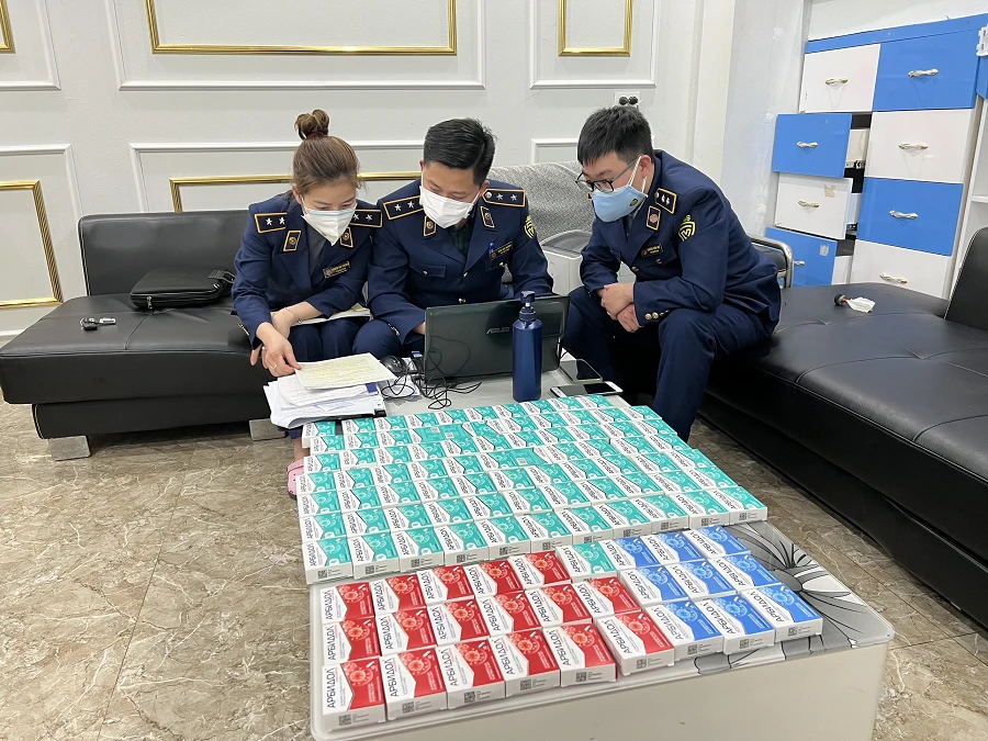 Quản lý thị trường thu giữ hàng trăm hộp thuốc điều trị COVID-19 không rõ nguồn gốc xuất xứ. Ảnh: LQ