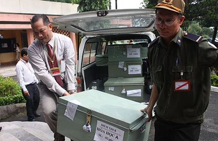 Đề thi là khâu quan trọng để chọn ngưỡng điểm tối thiểu vào ĐH, CĐ. Trong ảnh: Vận chuyển đề thi khối B năm 2013 tại hội đồng thi Trường ĐH Nông Lâm TP.HCM. Ảnh: QUỐC DŨNG