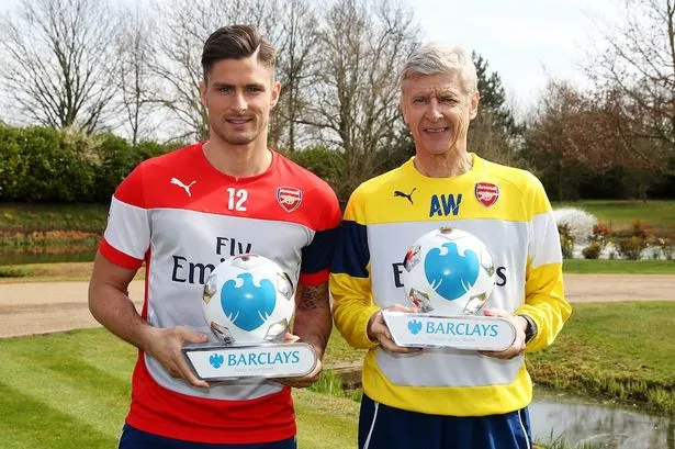 Bộ đôi Giroud và Wenger của Arsenal cười tươi bên giải thưởng cầu thủ và HLV xuất sắc nhất tháng 3 tại Premier League.