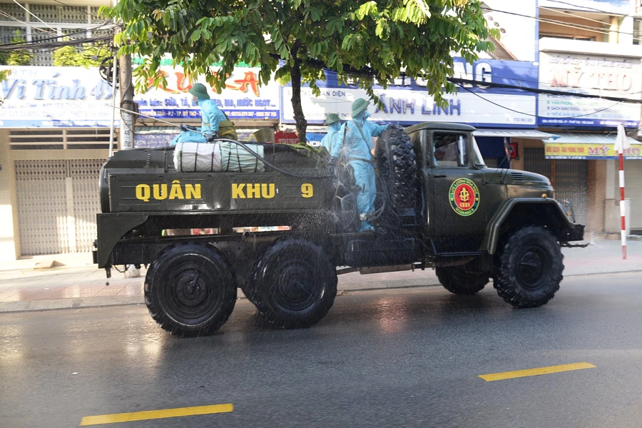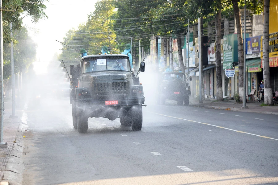 Tiểu đoàn Hóa học - Bộ Tham mưu (Quân khu 9) phun thuốc khử khuẩn tại TP Mỹ Tho, tỉnh Tiền Giang. Ảnh: PV