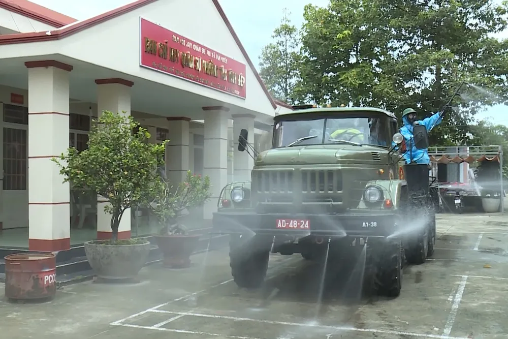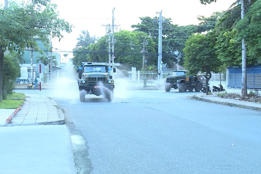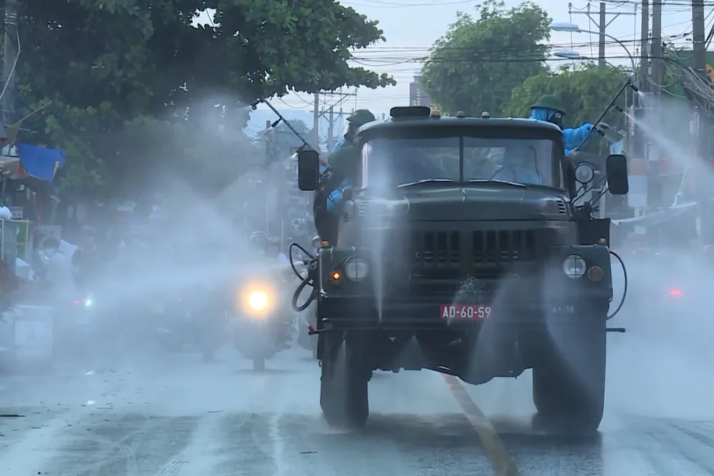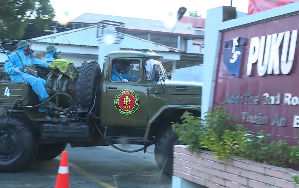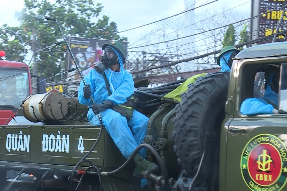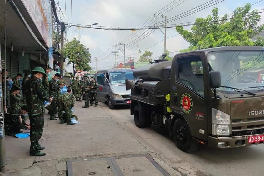 Hình ảnh bộ đội phun khử khuẩn tại các điểm nóng về dịch COVID-19 tại Bình Dương.