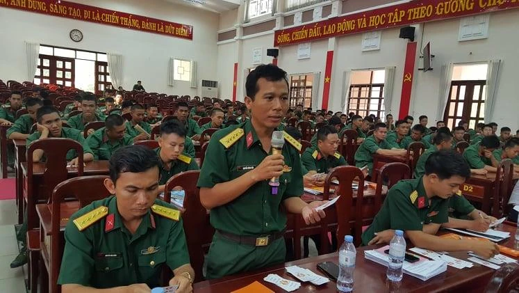 Sĩ quan, chiến sĩ Sư đoàn 9 thẳng thắn chia sẻ nhiều quan điểm về dạy dỗ con cái, bảo vệ phụ nữ- trẻ em. Ảnh: HỒNG MINH