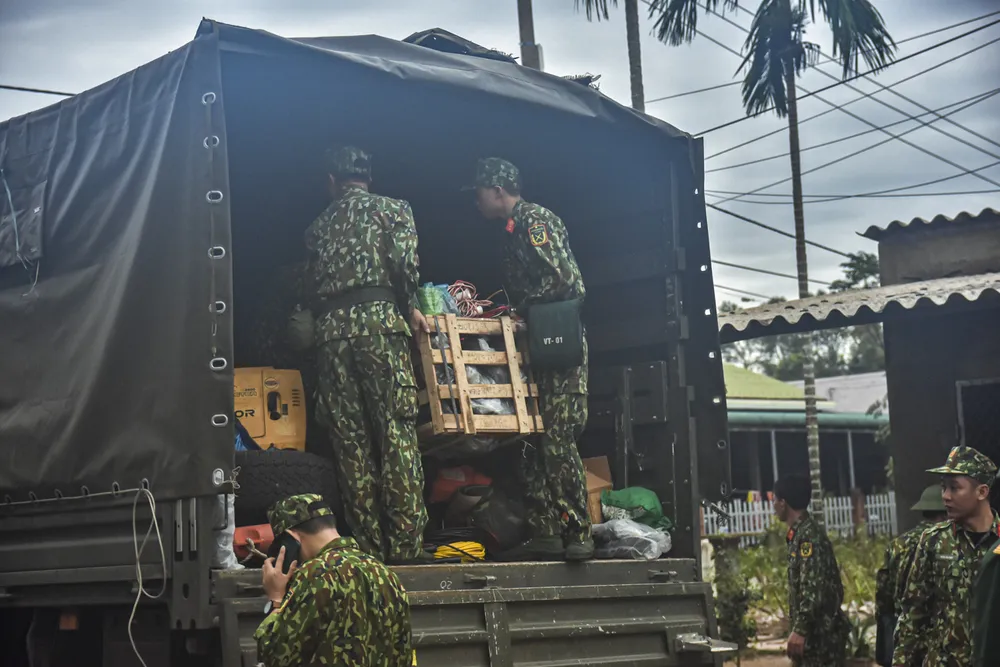 Bộ đội cùng với những thiết bị, nhu yếu phẩm được đưa vào hiện trường. Ảnh: NGUYỄN DO